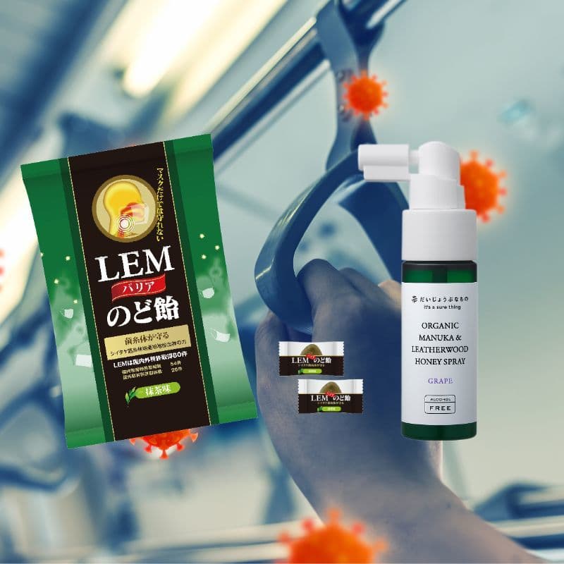 シイタケ菌糸体エキス**を使用した「インフルブロック LEMバリアのど飴」は、うがいと同様のバリア効果を持ち、外出先でも安心してお使いいただけます。人ごみや閉鎖された空間でも、あなたの喉をしっかりガード!
